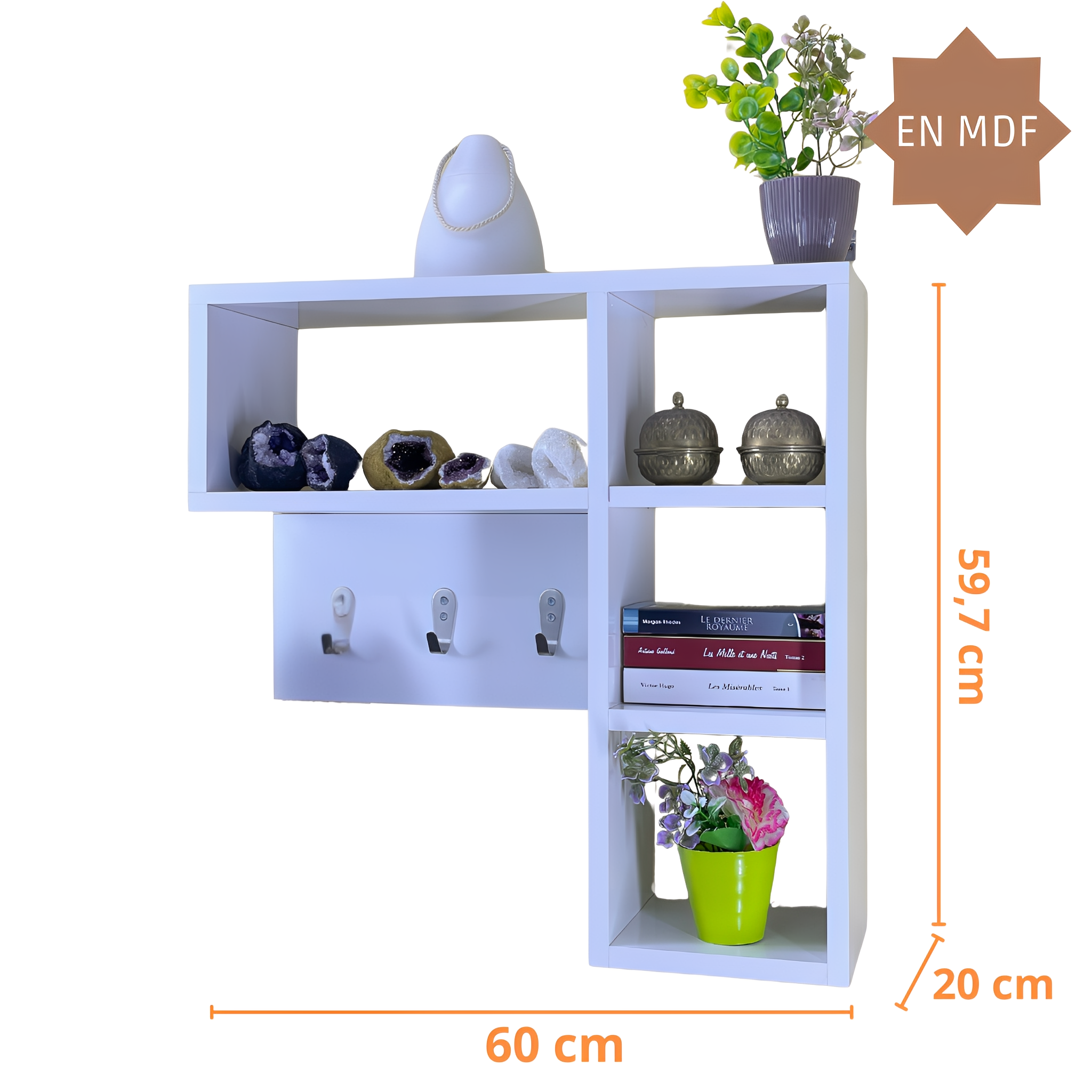 Un design pratique et élégant avec 3 étagères carrées et une étagère rectangulaire, accompagnées de 3 porte-vêtements pour un rangement optimal. Ce produit mesure :Longueur : 60 cm-Largeur / profondeur (étagère) : 20 cm-Hauteur : 59,7 cm